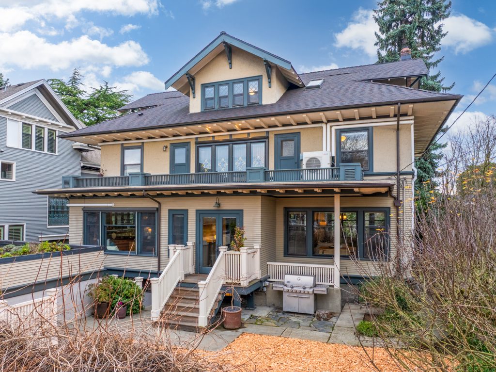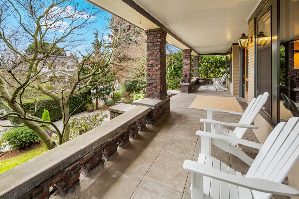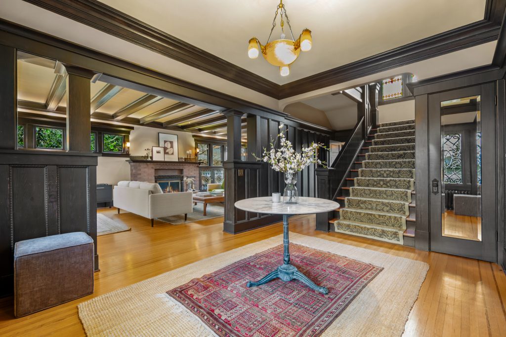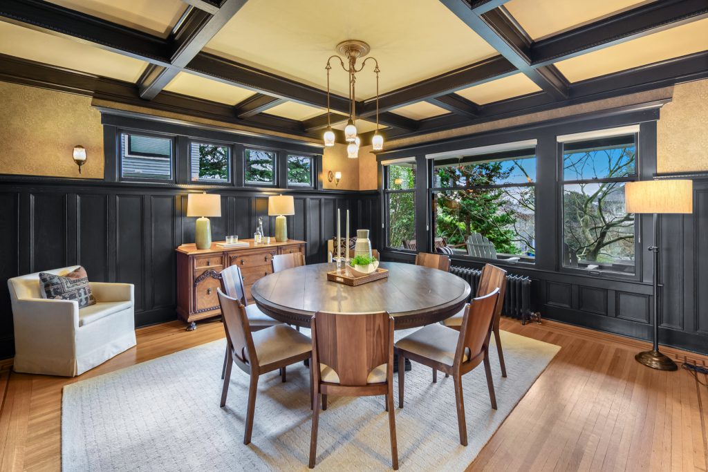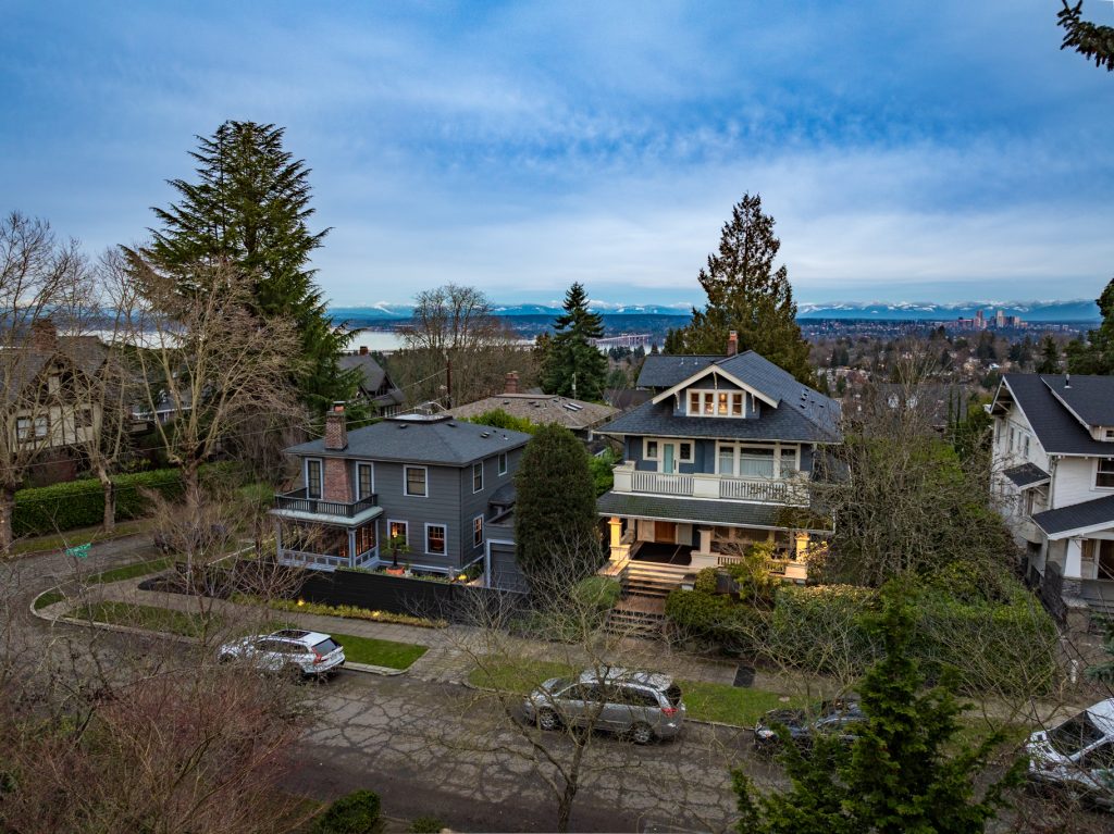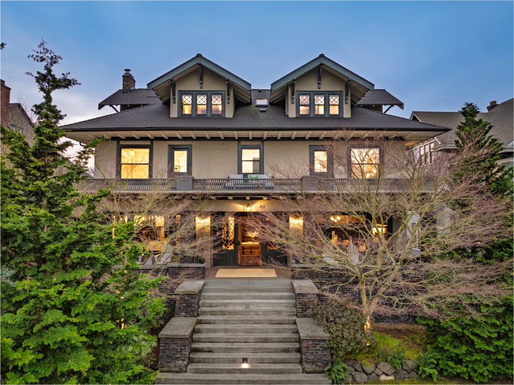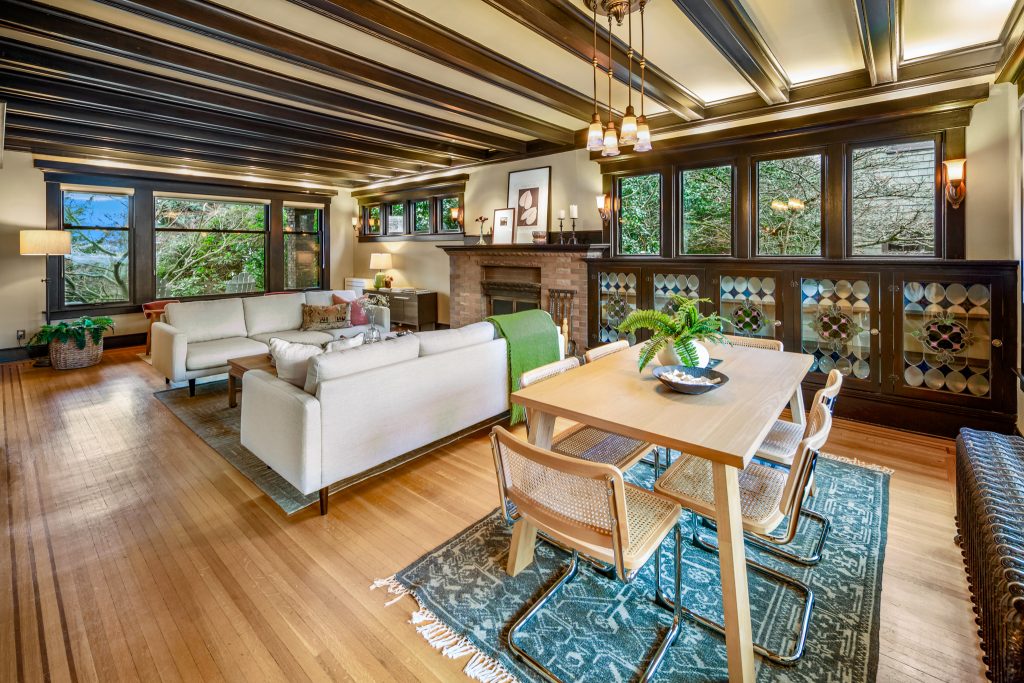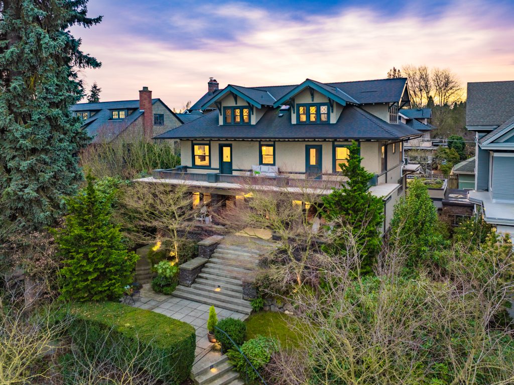 A sultry Foursquare Craftsman of rare scale, sophisticated in style yet genuinely inviting. Grand rooms feel warm and livable, with thoughtful updates seamlessly integrated into rich original woodwork so elegance never comes at the expense of comfort. A stately, storybook front porch sets the tone for morning coffee, evening libations, and effortless neighborly connection. Designed with Prairie-style influence and perfectly scaled living areas. The heart of the home is the spacious updated kitchen flooded with natural light, with vistas of the landscaped yard and living roof on the rebuilt 2 car garage. Wonderful flow and features, throughout, create a home for day-to-day as well as special occasions. Space for all in upper two levels featuring views that stretch across Lake Washington, the Cascade Mountains, and the Bellevue skyline. Expansive primary with view terrace spanning the front of the home plus five additional generous bedrooms, three plus baths and laundry all above grade. A high-ceilinged lower level with fully opening sliding glass walls to a private courtyard. Play, media and wine room as well as workshop/studio with separate exterior access. Renovated with care in period style, the home honors its Craftsman roots while remaining wonderfully accessible. Admired, improved, and quietly coveted through generations, all just moments from parks, shops, restaurants, and effortless commuting to downtown Seattle and the Eastside.