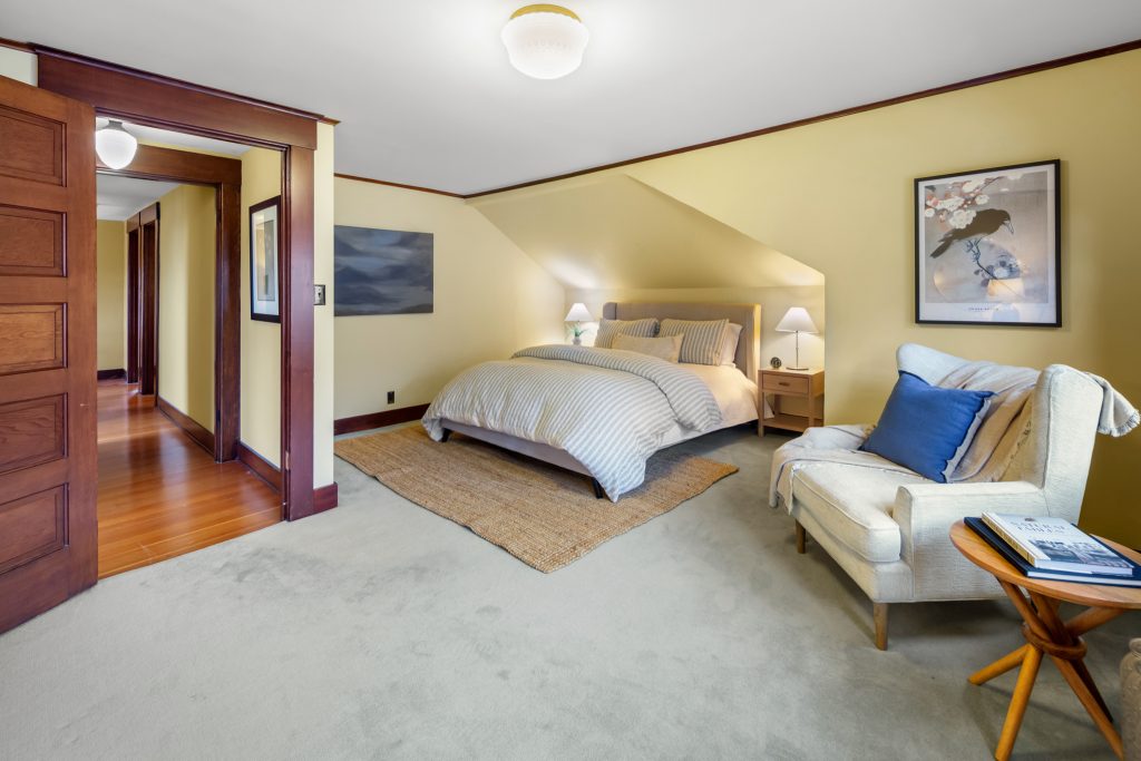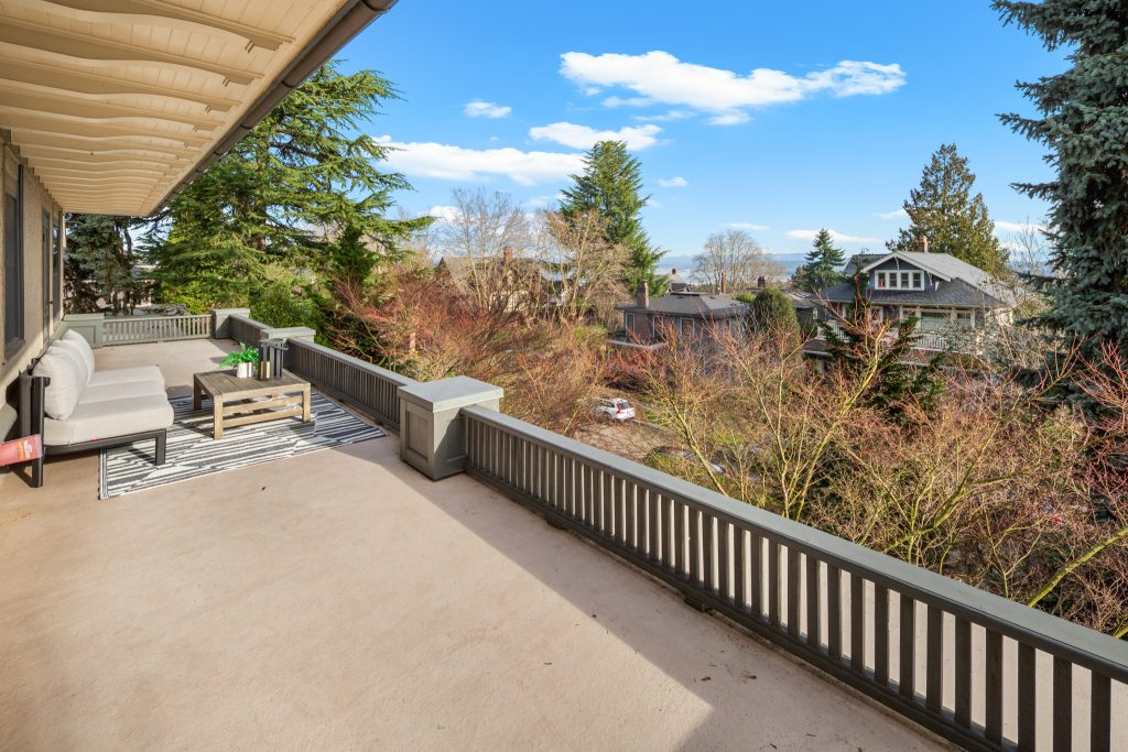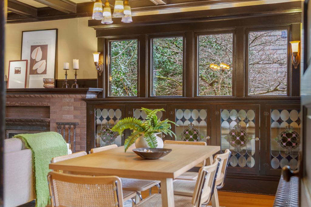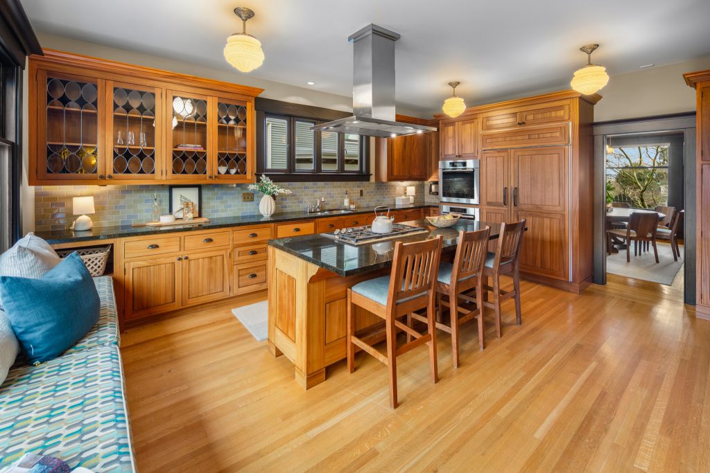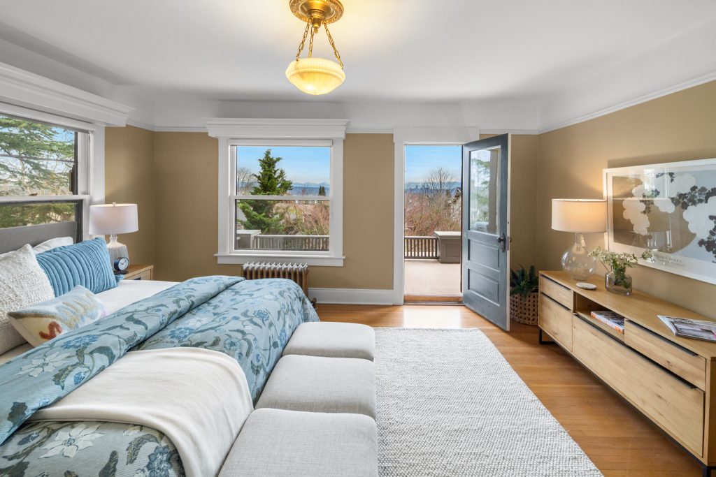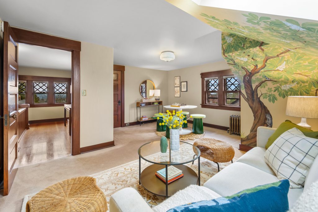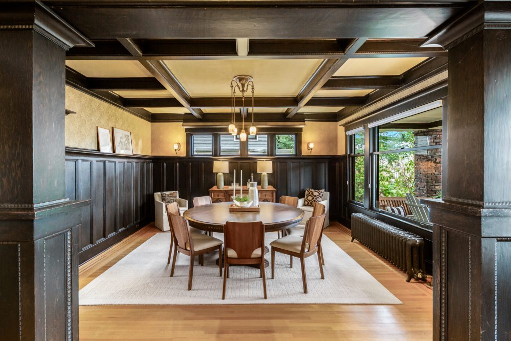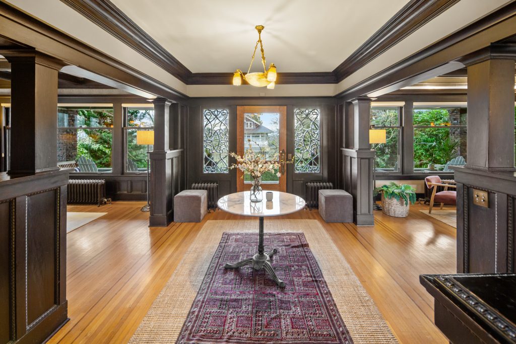 A sultry Foursquare Craftsman of rare scale, sophisticated in style yet genuinely inviting. Grand rooms feel warm and livable, with thoughtful updates seamlessly integrated into rich original woodwork so elegance never comes at the expense of comfort. A stately, storybook front porch sets the tone for morning coffee, evening libations, and effortless neighborly connection. Designed with Prairie-style influence and perfectly scaled living areas. The heart of the home is the spacious updated kitchen flooded with natural light, with vistas of the landscaped yard and living roof on the rebuilt 2 car garage. Wonderful flow and features, throughout, create a home for day-to-day as well as special occasions. Space for all in upper two levels featuring views that stretch across Lake Washington, the Cascade Mountains, and the Bellevue skyline. Expansive primary with view terrace spanning the front of the home plus five additional generous bedrooms, three plus baths and laundry all above grade. A high-ceilinged lower level with fully opening sliding glass walls to a private courtyard. Play, media and wine room as well as workshop/studio with separate exterior access. Renovated with care in period style, the home honors its Craftsman roots while remaining wonderfully accessible. Admired, improved, and quietly coveted through generations, all just moments from parks, shops, restaurants, and effortless commuting to downtown Seattle and the Eastside.