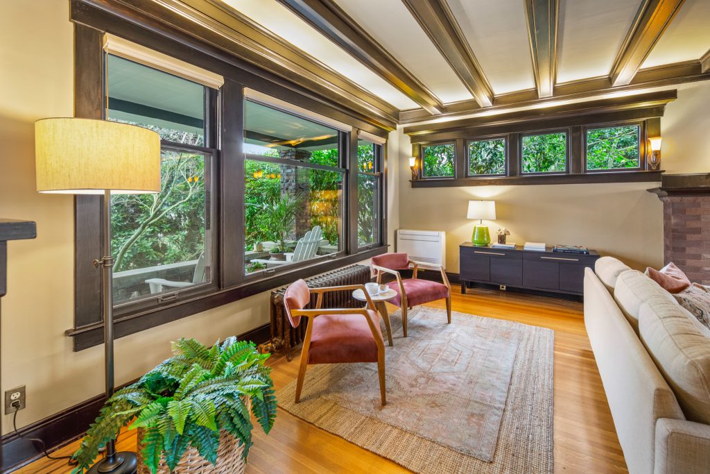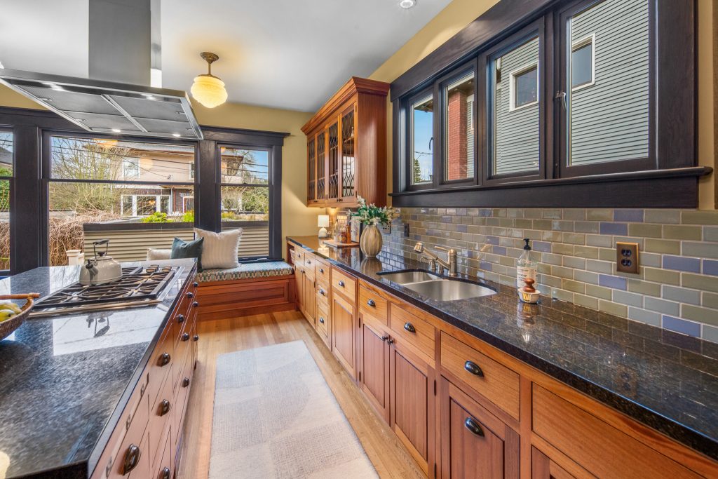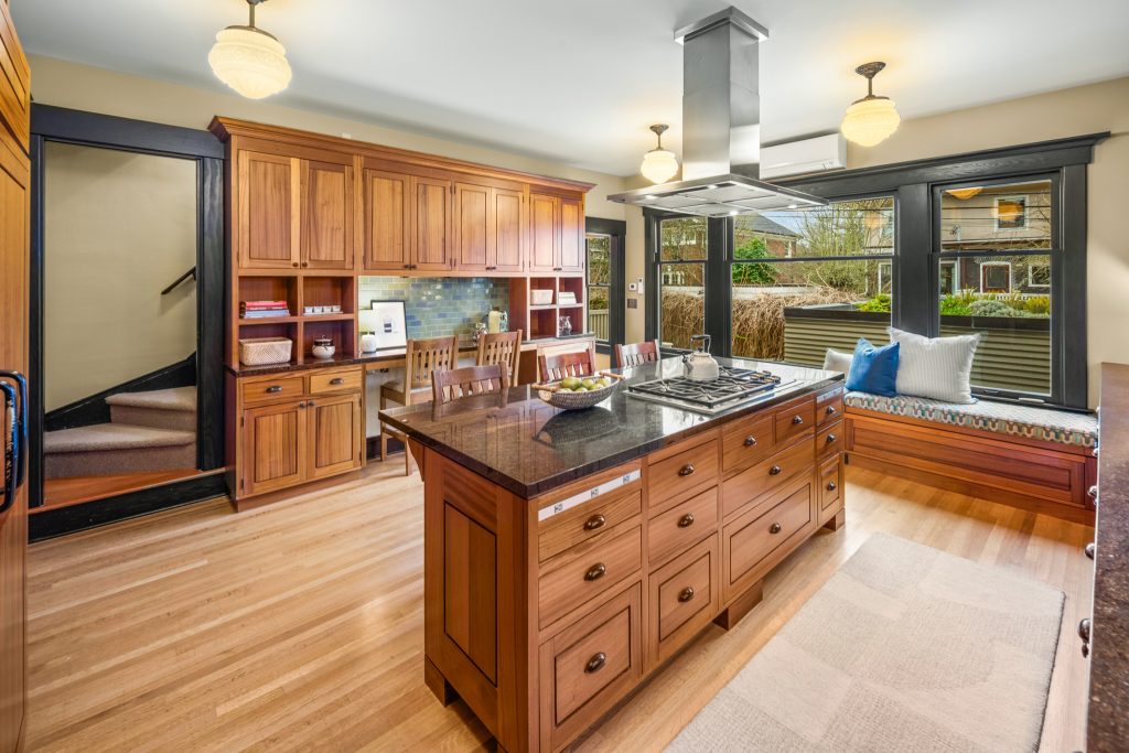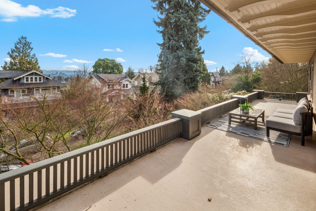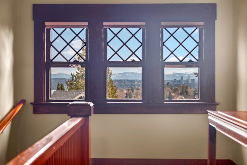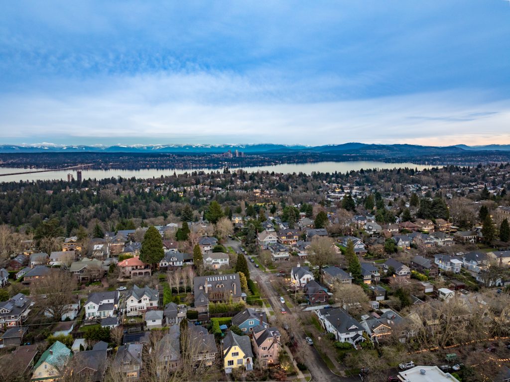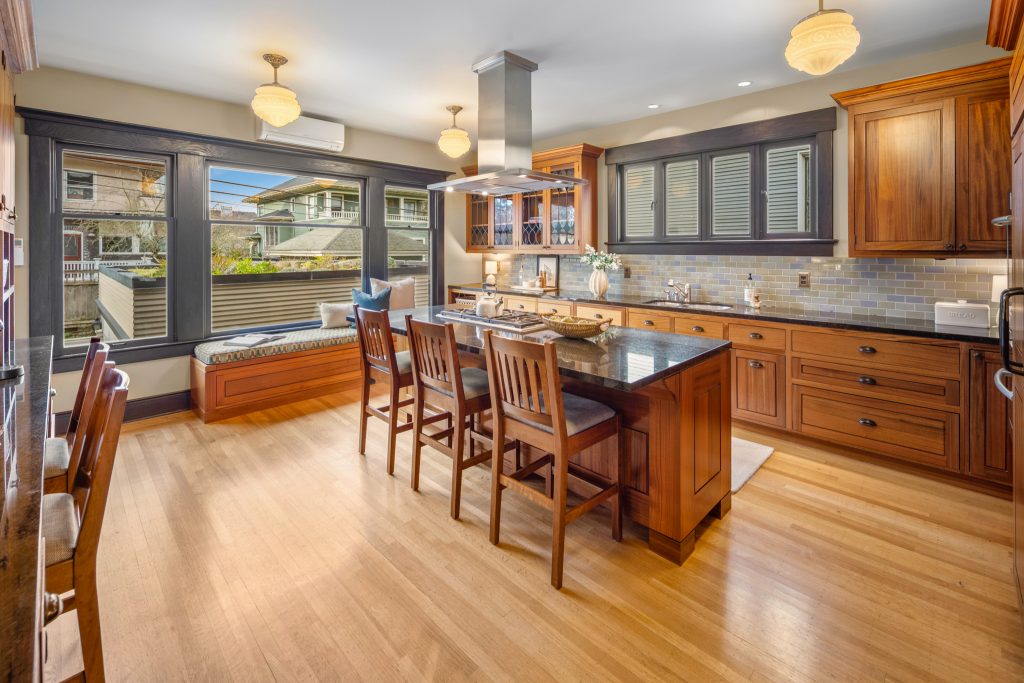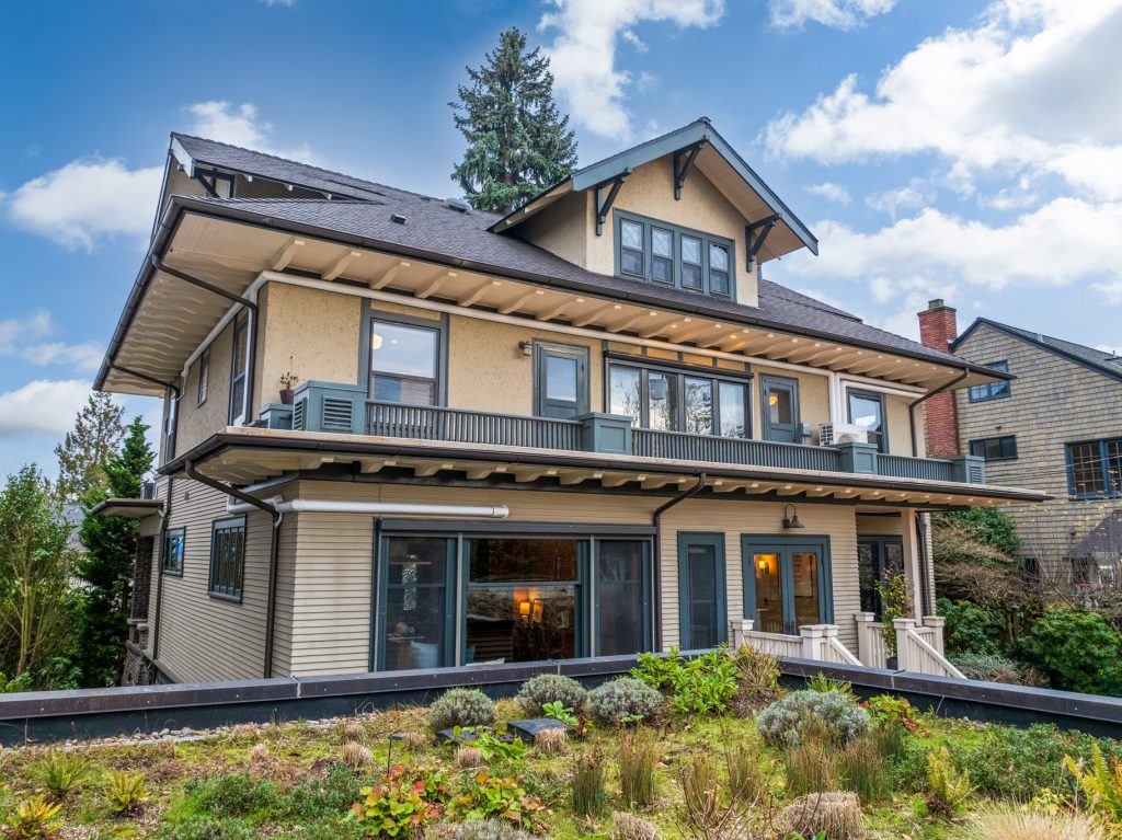 A sultry Foursquare Craftsman of rare scale, sophisticated in style yet genuinely inviting. Grand rooms feel warm and livable, with thoughtful updates seamlessly integrated into rich original woodwork so elegance never comes at the expense of comfort. A stately, storybook front porch sets the tone for morning coffee, evening libations, and effortless neighborly connection. Designed with Prairie-style influence and perfectly scaled living areas. The heart of the home is the spacious updated kitchen flooded with natural light, with vistas of the landscaped yard and living roof on the rebuilt 2 car garage. Wonderful flow and features, throughout, create a home for day-to-day as well as special occasions. Space for all in upper two levels featuring views that stretch across Lake Washington, the Cascade Mountains, and the Bellevue skyline. Expansive primary with view terrace spanning the front of the home plus five additional generous bedrooms, three plus baths and laundry all above grade. A high-ceilinged lower level with fully opening sliding glass walls to a private courtyard. Play, media and wine room as well as workshop/studio with separate exterior access. Renovated with care in period style, the home honors its Craftsman roots while remaining wonderfully accessible. Admired, improved, and quietly coveted through generations, all just moments from parks, shops, restaurants, and effortless commuting to downtown Seattle and the Eastside.