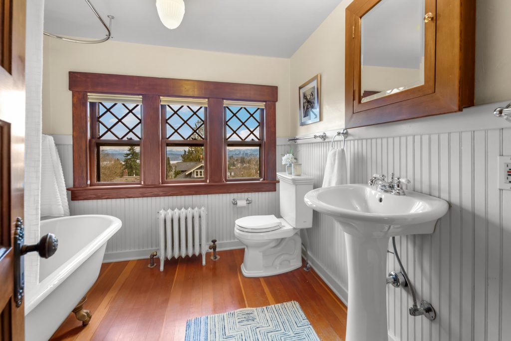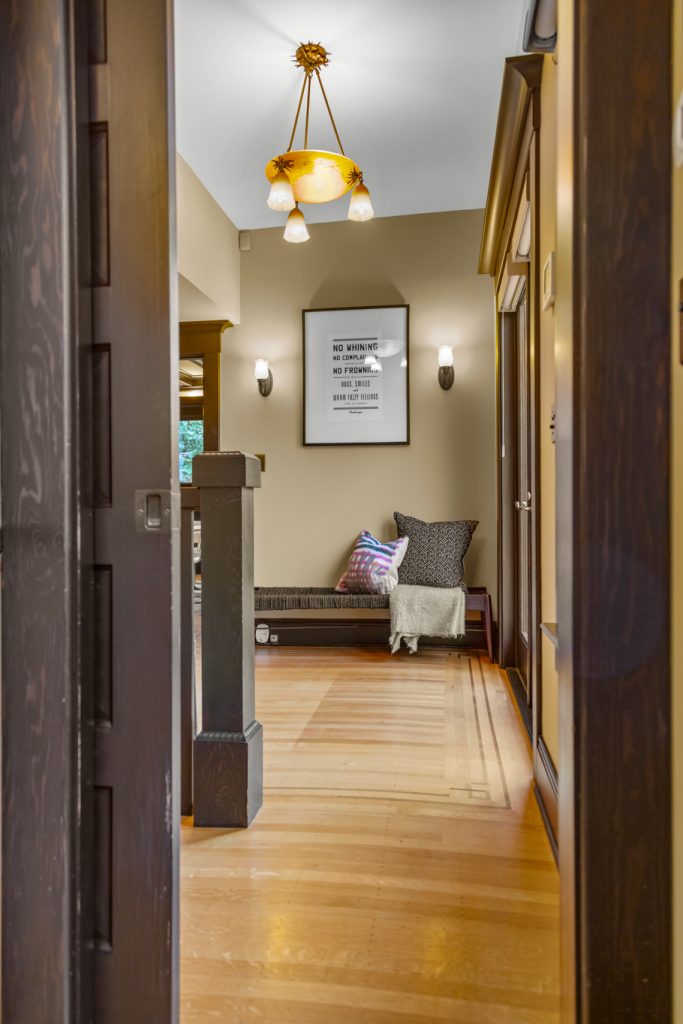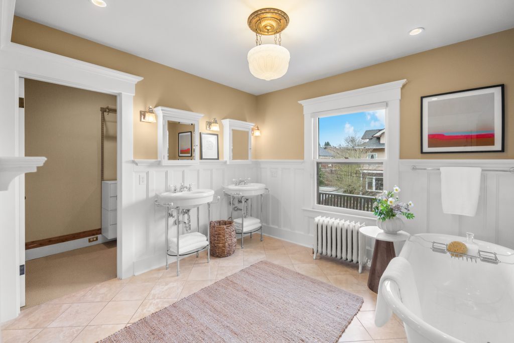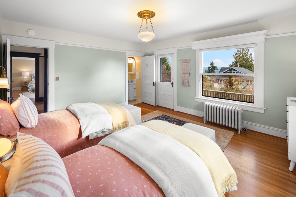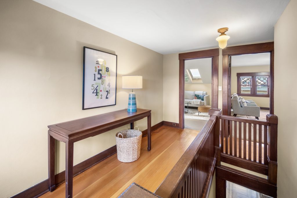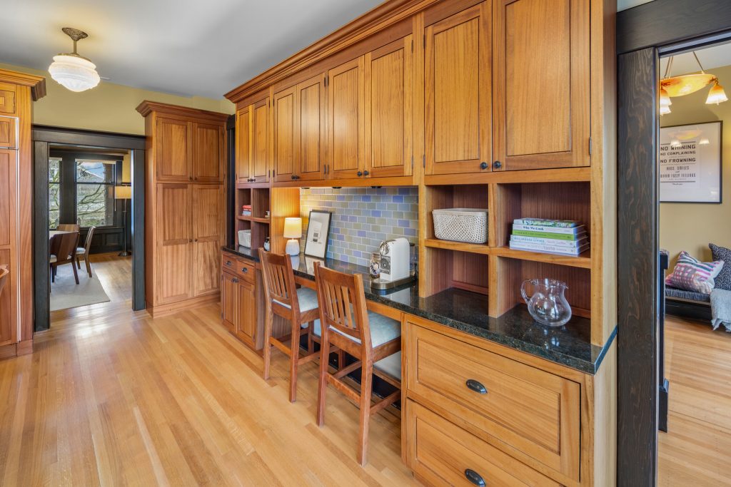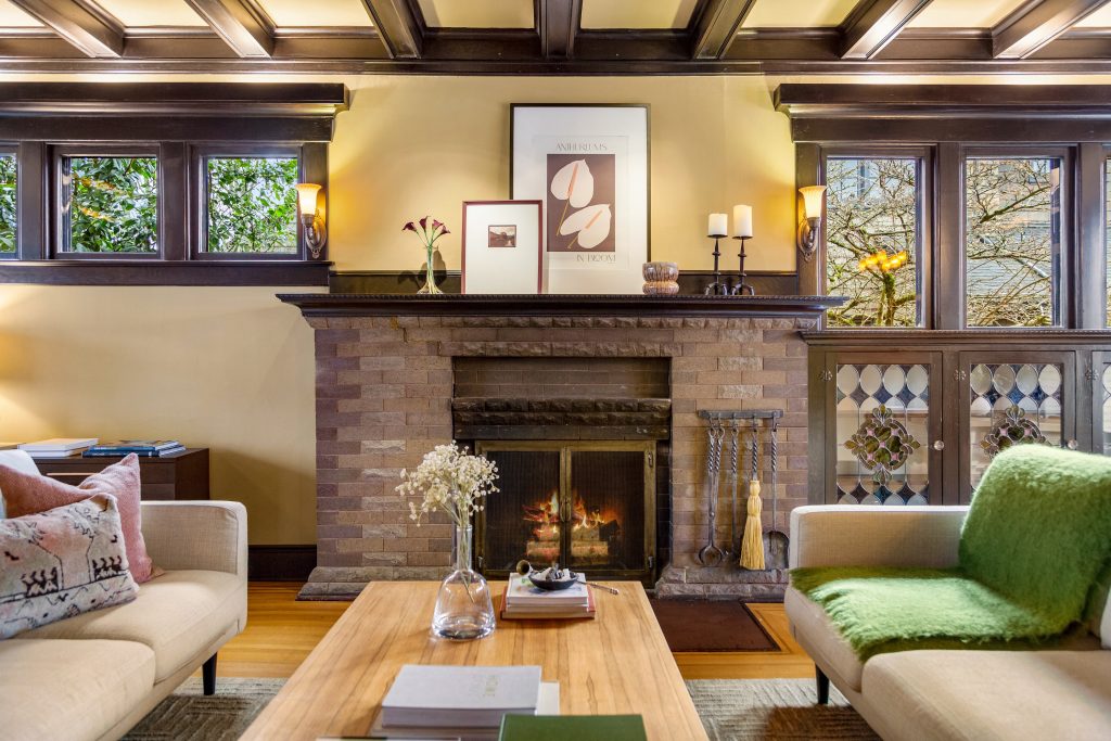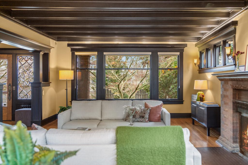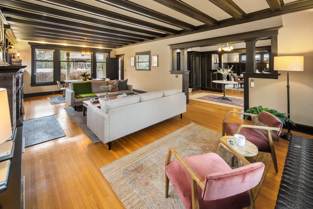 A sultry Foursquare Craftsman of rare scale, sophisticated in style yet genuinely inviting. Grand rooms feel warm and livable, with thoughtful updates seamlessly integrated into rich original woodwork so elegance never comes at the expense of comfort. A stately, storybook front porch sets the tone for morning coffee, evening libations, and effortless neighborly connection. Designed with Prairie-style influence and perfectly scaled living areas. The heart of the home is the spacious updated kitchen flooded with natural light, with vistas of the landscaped yard and living roof on the rebuilt 2 car garage. Wonderful flow and features, throughout, create a home for day-to-day as well as special occasions. Space for all in upper two levels featuring views that stretch across Lake Washington, the Cascade Mountains, and the Bellevue skyline. Expansive primary with view terrace spanning the front of the home plus five additional generous bedrooms, three plus baths and laundry all above grade. A high-ceilinged lower level with fully opening sliding glass walls to a private courtyard. Play, media and wine room as well as workshop/studio with separate exterior access. Renovated with care in period style, the home honors its Craftsman roots while remaining wonderfully accessible. Admired, improved, and quietly coveted through generations, all just moments from parks, shops, restaurants, and effortless commuting to downtown Seattle and the Eastside.