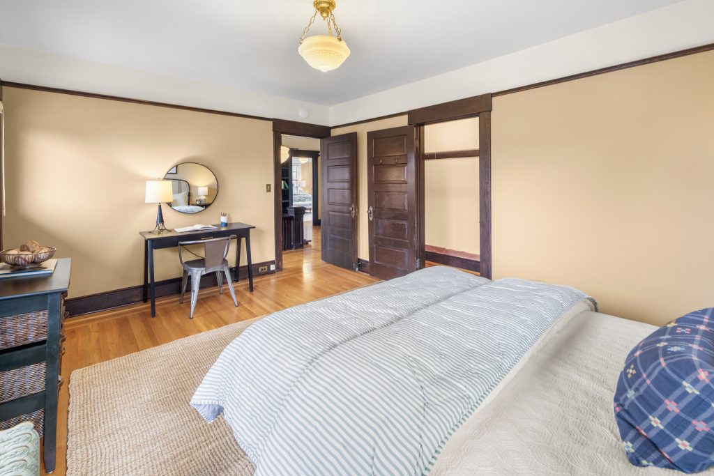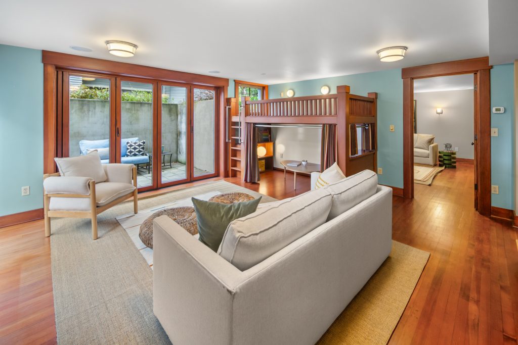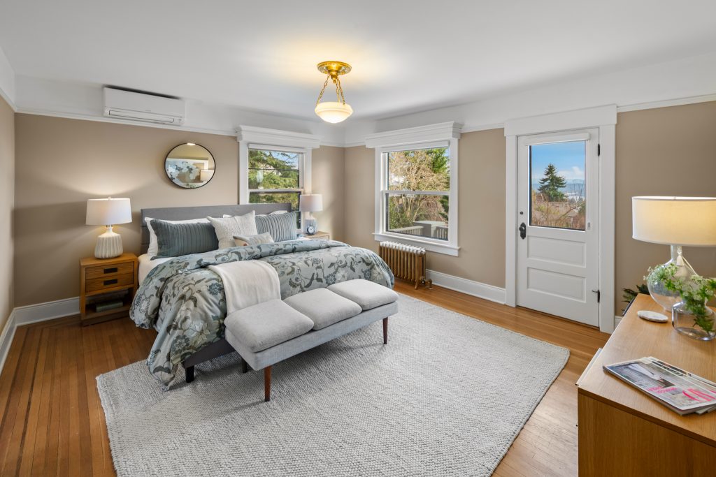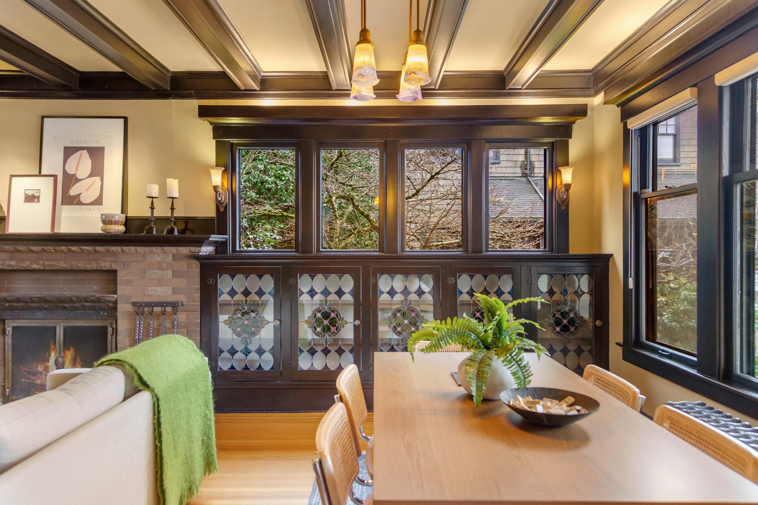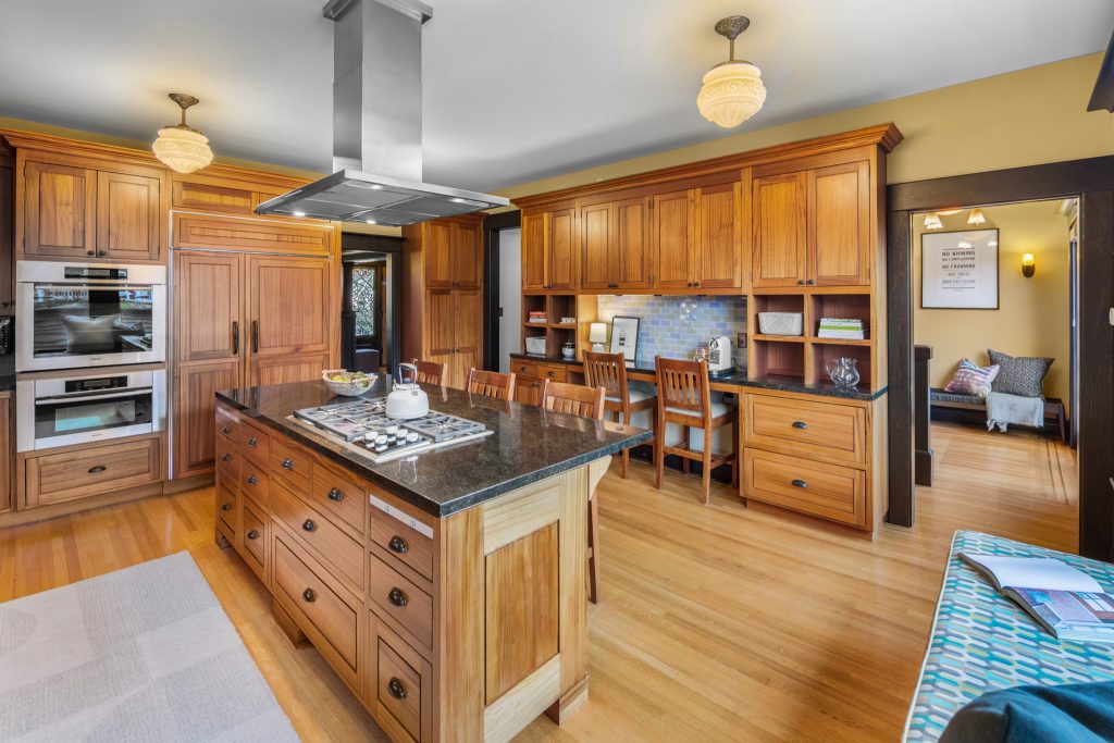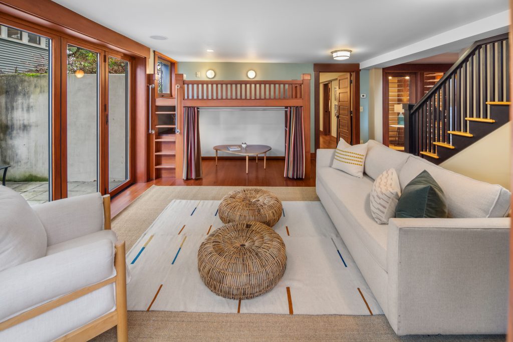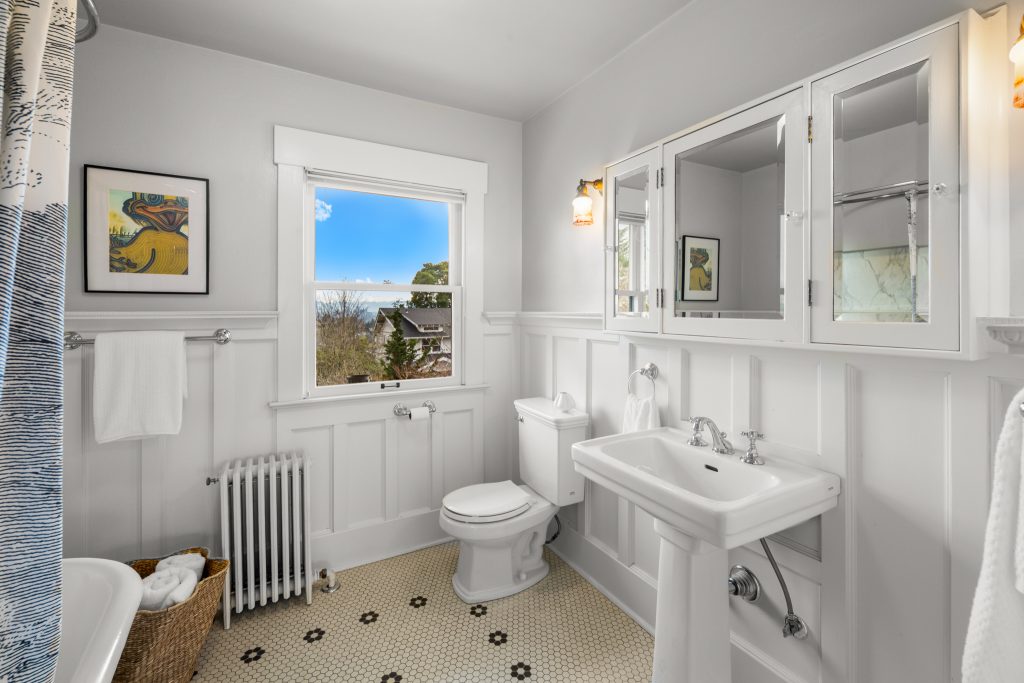 A sultry Foursquare Craftsman of rare scale, sophisticated in style yet genuinely inviting. Grand rooms feel warm and livable, with thoughtful updates seamlessly integrated into rich original woodwork so elegance never comes at the expense of comfort. A stately, storybook front porch sets the tone for morning coffee, evening libations, and effortless neighborly connection. Designed with Prairie-style influence and perfectly scaled living areas. The heart of the home is the spacious updated kitchen flooded with natural light, with vistas of the landscaped yard and living roof on the rebuilt 2 car garage. Wonderful flow and features, throughout, create a home for day-to-day as well as special occasions. Space for all in upper two levels featuring views that stretch across Lake Washington, the Cascade Mountains, and the Bellevue skyline. Expansive primary with view terrace spanning the front of the home plus five additional generous bedrooms, three plus baths and laundry all above grade. A high-ceilinged lower level with fully opening sliding glass walls to a private courtyard. Play, media and wine room as well as workshop/studio with separate exterior access. Renovated with care in period style, the home honors its Craftsman roots while remaining wonderfully accessible. Admired, improved, and quietly coveted through generations, all just moments from parks, shops, restaurants, and effortless commuting to downtown Seattle and the Eastside.